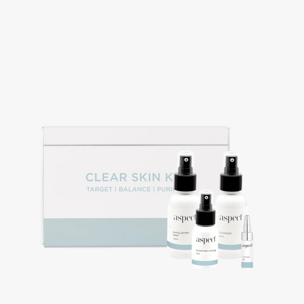 Address problematic skin with the Aspect Clear Skin Kit to achieve a clearer-looking complexion. This skincare kit contains our Clear Skin Exfoliating Prep 100ml, Clear Skin Cleanser 100ml, Clear Skin Lotion 50ml and Stop Spot 8ml.