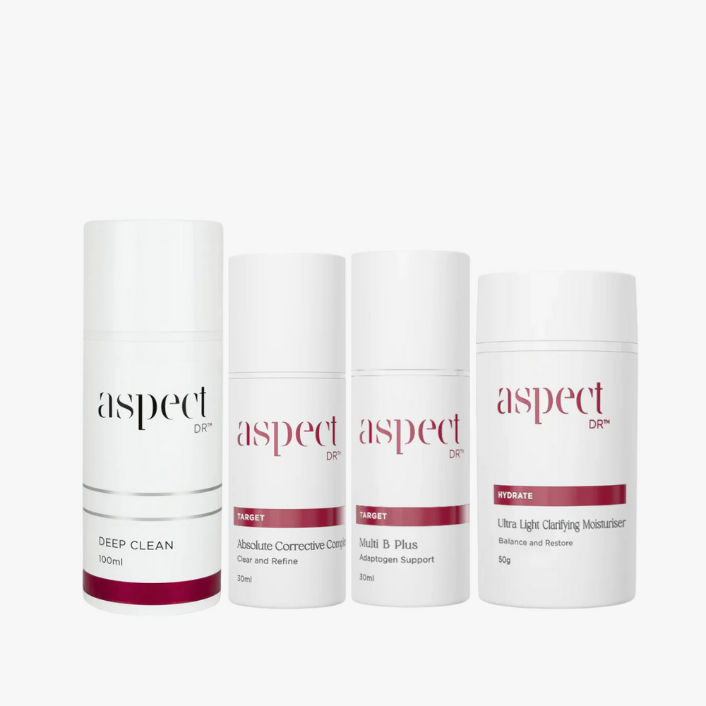A complete skin-resetting regimen designed to purify, balance, and rejuvenate. Start with Aspect Dr Deep Clean, a powerful yet gentle cleanser to remove impurities and refine pores. Follow with Multi B Serum to strengthen and energise stressed skin, then target imbalances with Absolute Corrective Complex, formulated to refine texture, reduce blemishes, and restore clarity. Finish with Ultra Light Moisturiser, delivering weightless hydration and a matte finish ideal for all skin types, including oily or combination. Together, this collection supports healthier, clearer, and more radiant skin every day.