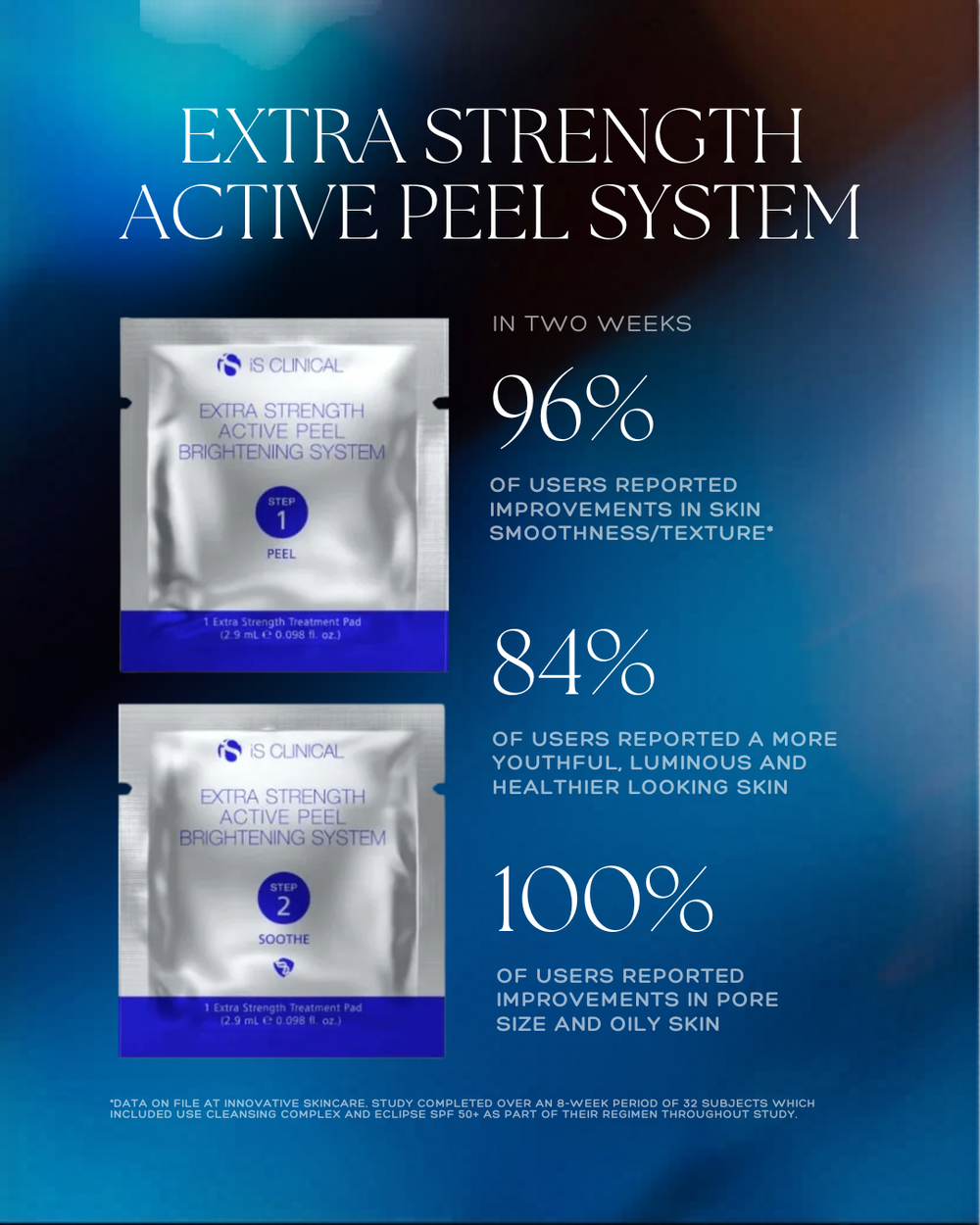 Achieve professional-grade results with clinically advanced Extra Strength Active Peel Brightening System. This powerful, fast-acting, two-step treatment is designed to visibly resurface and brighten the skin’s appearance while providing advanced hydration, minimising the appearance of fine lines and renewing the look of skin tone and texture. Experience instantly glowing skin as well as long-term results with this breakthrough brightening at home treatment.