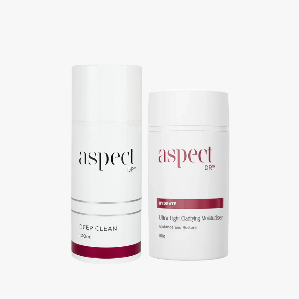 A simple yet effective duo designed to keep oily and congested skin clear, balanced, and hydrated. Aspect Dr Deep Clean works to purify pores and remove excess oil without stripping the skin, while Ultra Light Moisturiser delivers weightless hydration and a matte finish to maintain a healthy skin barrier without clogging pores. Perfect for daily use, this bundle is your go-to for a fresh, shine-free complexion.