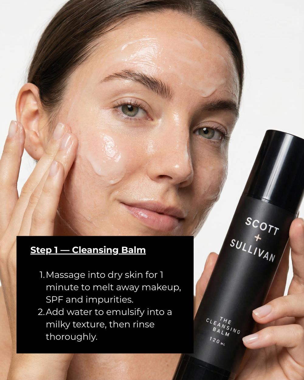 Step 1 — Cleansing Balm Massage into dry skin for 1 minute to melt away makeup, SPF and impurities. Add water to emulsify into a milky texture, then rinse thoroughly.