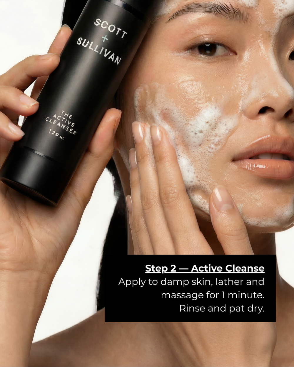 Step 2 — Active Cleanse Apply to damp skin, lather and massage for 1 minute. Rinse and pat dry.