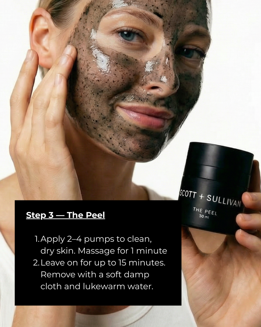 Step 3 — The Peel Apply 2–4 pumps to clean, dry skin. Massage for 1 minute, then leave on for up to 15 minutes. Remove with a soft damp cloth and lukewarm water.