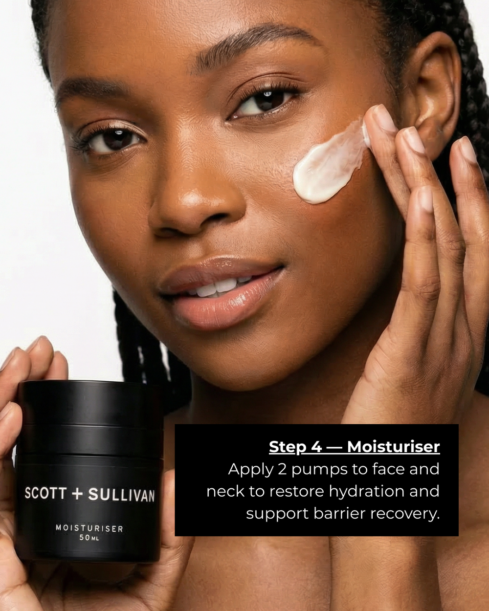 Step 4 — Moisturiser Apply 2 pumps to face and neck to restore hydration and support barrier recovery.