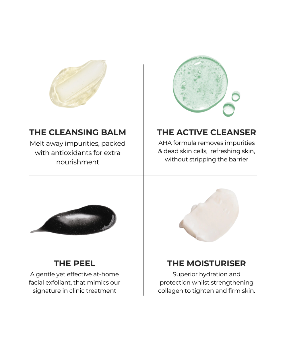 The 4-Step At-Home Peel Ritual is a complete exfoliation and restoration system that mimics our most versatile in-clinic peel — reimagined for safe, controlled at-home use.